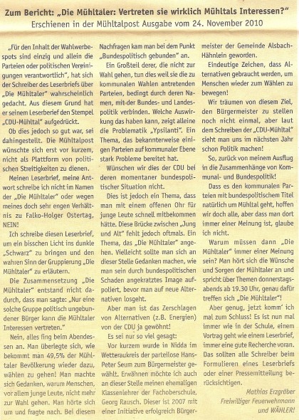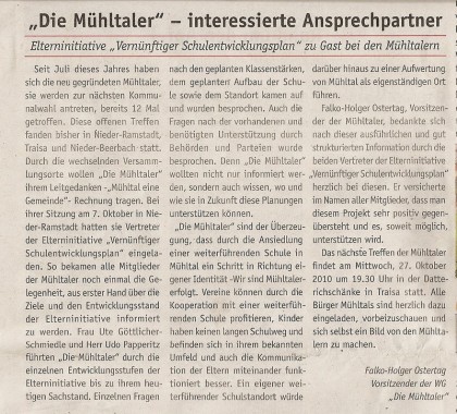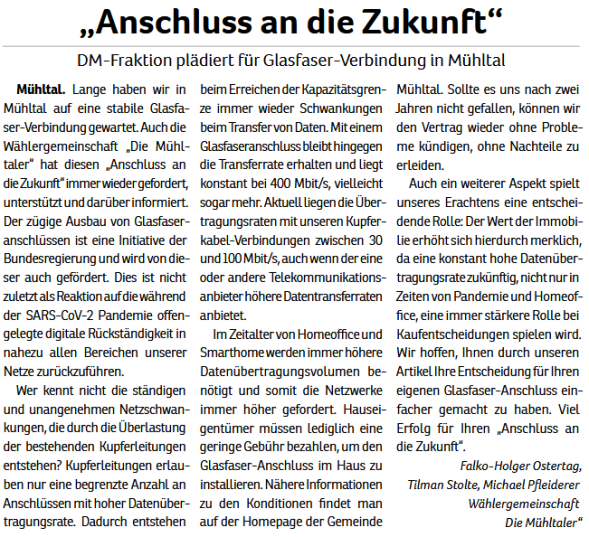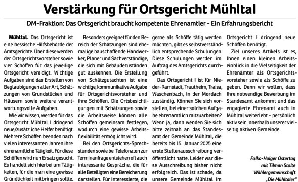 Wählergemeinschaften wie unsere entstehen in vielen Kommunen als Ergänzung zu etablierten Parteien. Seit 2011 sind „Die Mühltaler“ als Fraktion in der Gemeindevertretung vertreten und freuen sich über Menschen, die sich ebenfalls einbringen möchten.
