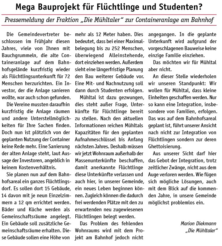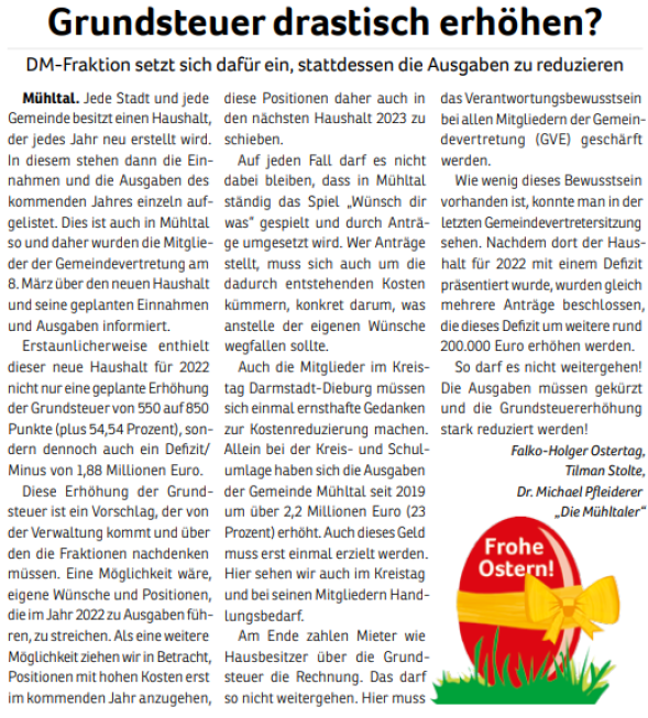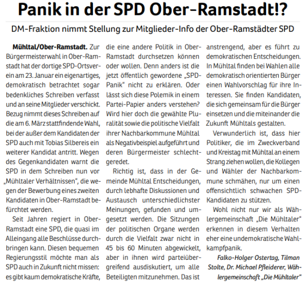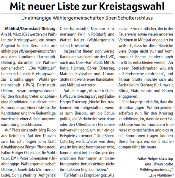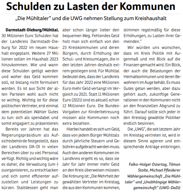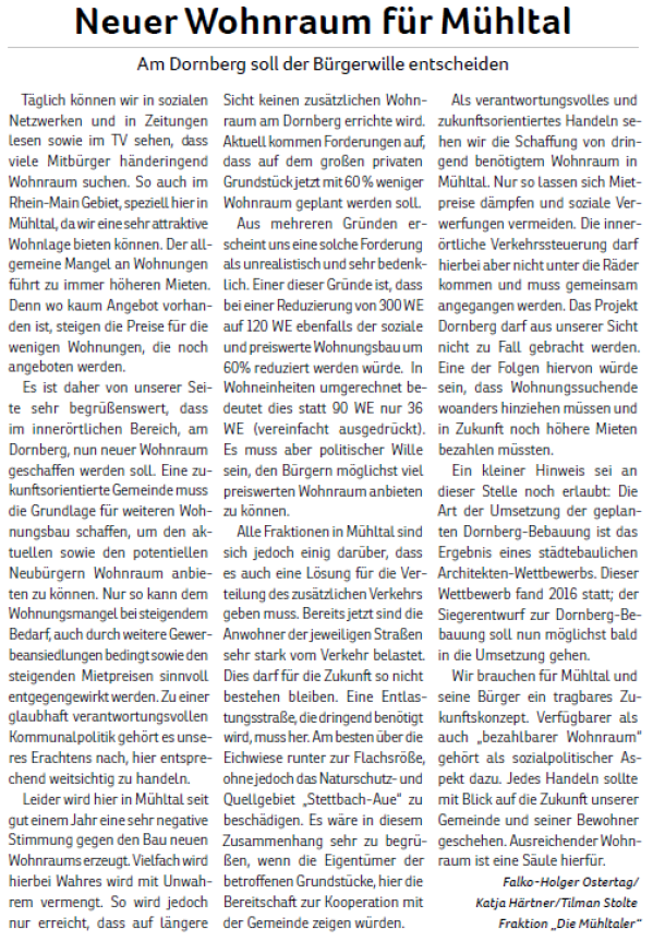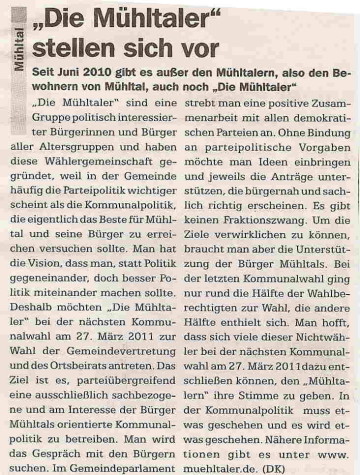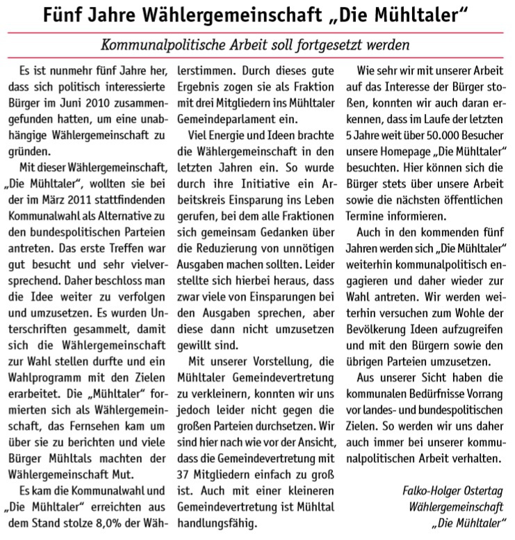 „Die Mühltaler“ gibt es seit Juni 2010. Aus einer ersten Idee wurde eine Wählergemeinschaft, die sich mehr Miteinander, transparente Entscheidungen und einen verantwortungsvollen Umgang mit Steuergeldern in Mühltal wünscht. 2011 traten wir erstmals zur Kommunalwahl an.