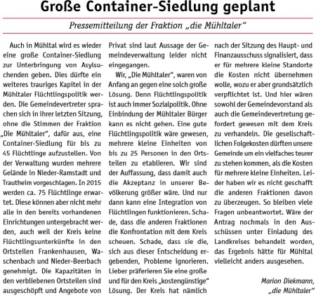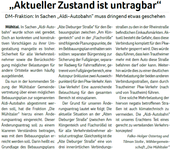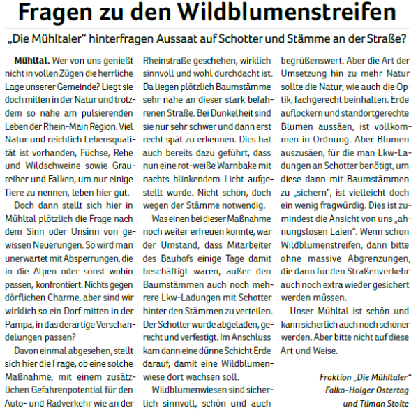 Nicht nur ein schönes Ortsbild und die Sicherheit im Verkehr, vor allem Umweltschutz durch Abfallvermeidung waren der Grund für den Antrag. Mit Ausnahme der Fraktion „Die Mühltaler“ haben alle Gemeindevertreter gegen die „neue Bescheidenheit“ im Wahlkampf gestimmt.