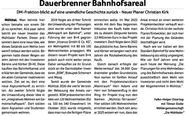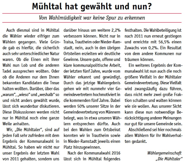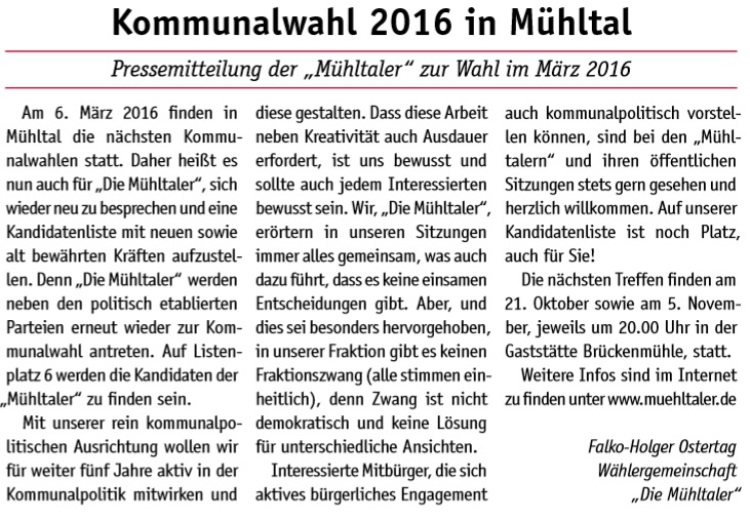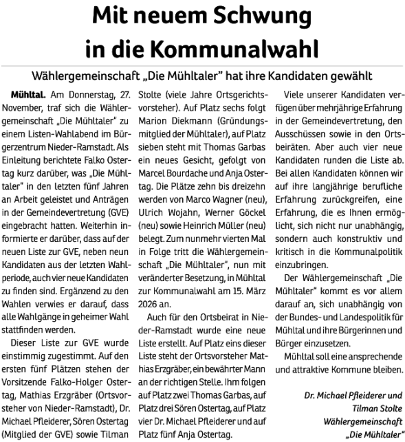 Wie auch schon 2011, 2016 und 2021 tritt die Wählergemeinschaft "Die Mühltaler" auch 2026 wieder zur Kommunalwahl an. Wir wollen somit an die vergangenen erfolgreichen Jahre anknüpfen und bundes- sowie landesparteiunabhängig Politik im besten Interesse unserer schönen Kommune im Grünen machen.