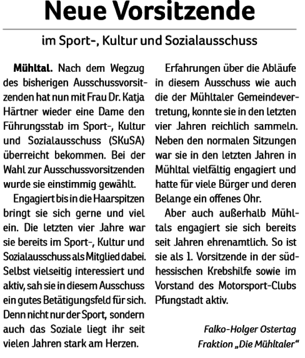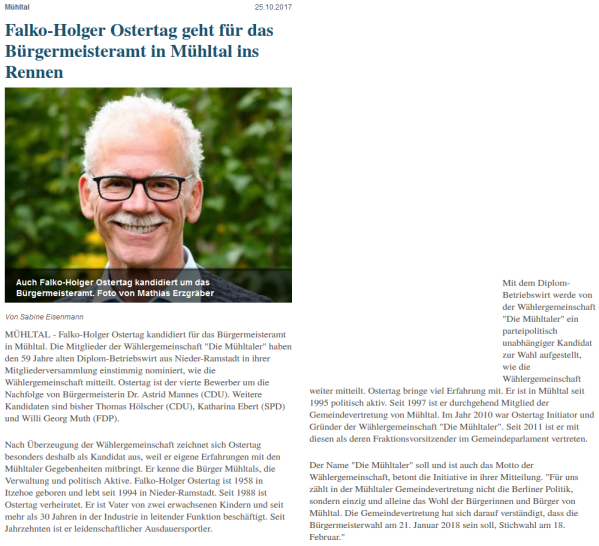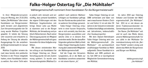 Er ist Gründungsmitglied und Fraktionsvorsitzender der Wählergemeinschaft „Die Mühltaler“ und seit rund 30 Jahren kommunalpolitisch aktiv. Falko-Holger Ostertag ist verheiratet, Vater von zwei Kindern und Großvater von fünf Enkelkindern. Seine Schwerpunkte sind die Bereiche Umwelt, Wohnungsbau und Finanzen.