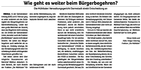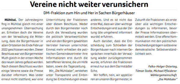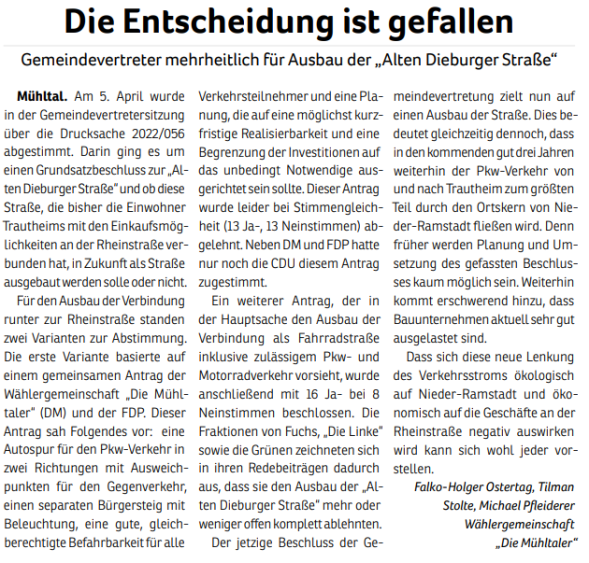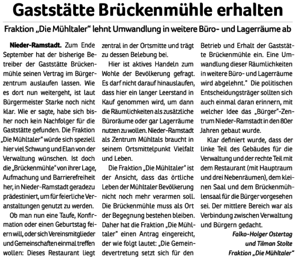 Ein entsprechender Antrag der Fraktion „Die Mühltaler“ wurde allerdings in der Gemeindevertretung mit 15 zu 19 Stimmen abgelehnt. In den Augen von CDU, Grüne und „Linke“ scheinen zusätzliche Lagerflächen und Büros für die Verwaltung wichtiger. Wichtiger denn das Interesse der Mühltaler Bürgerinnen und Bürger, die sich im Zentrum von Nieder-Ramstadt einen Ort der Gastlichkeit und der Begegnung wünschen.