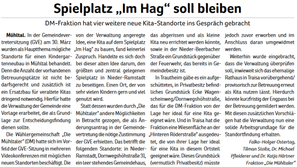 - Für eine langfristige und zuverlässige Kinderbetreuung. Wir sehen hier den Schwerpunkt der Betreuung bei den Gemeindekindergärten sowie der Kitas der Ev. Kirche.