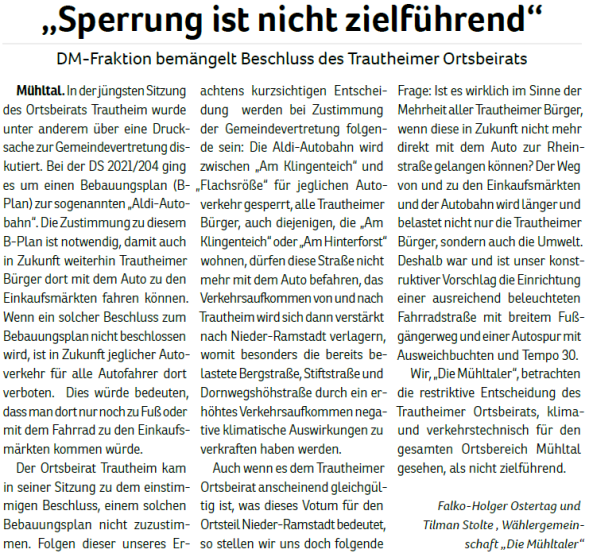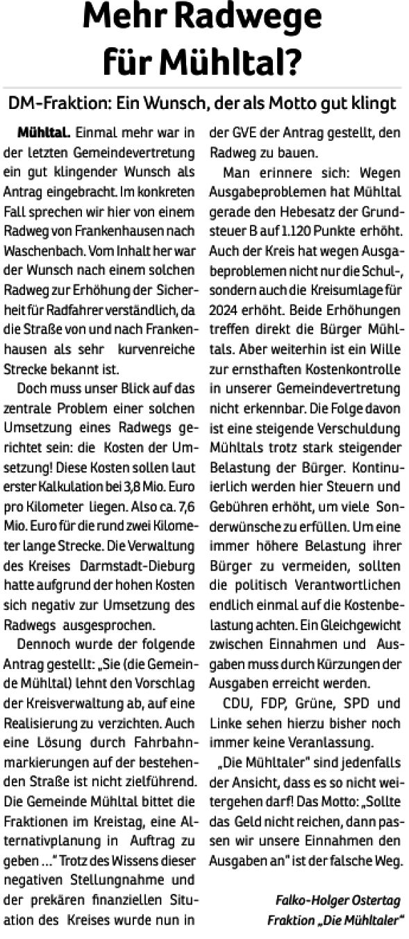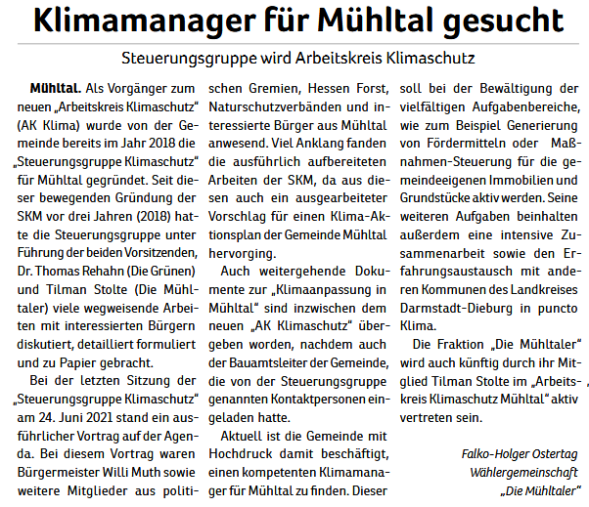 - Stärkung und Entwicklung des Wirtschaftsstandorts Mühltal. Arbeitsplätze und Gewerbesteuer sind wichtig für Mühltal.