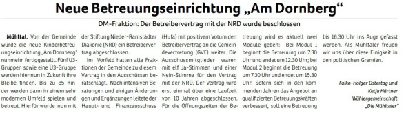 - Kontinuierliche Weiterentwicklung aller Betreuungsformen (U3, Ü3, Tagesmütter und Betreuung am Nachmittag) in Mühltal.