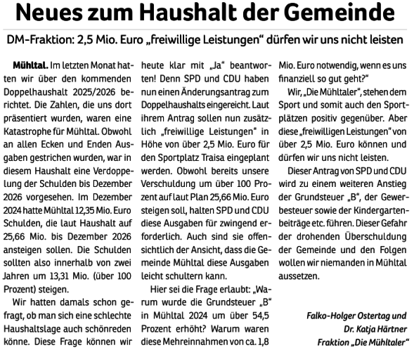 Begründet wurde der Vorstoß mit der angespannten Haushaltslage der Gemeinde. Der aktuelle Doppelhaushalt 2025/2026 konnte nur durch einen Erlass des Innenministeriums genehmigt werden. Gleichzeitig steht die langfristige Zahlungsfähigkeit der Gemeinde unter Beobachtung der Kommunalaufsicht. Laut Planung sollen sich die Schulden innerhalb von zwei Jahren von 12 auf 24 Millionen Euro verdoppeln.