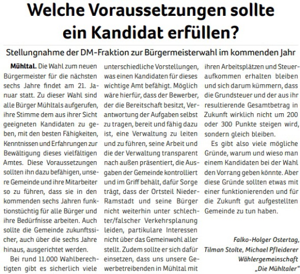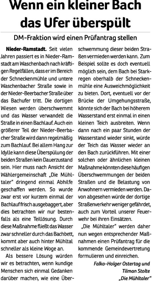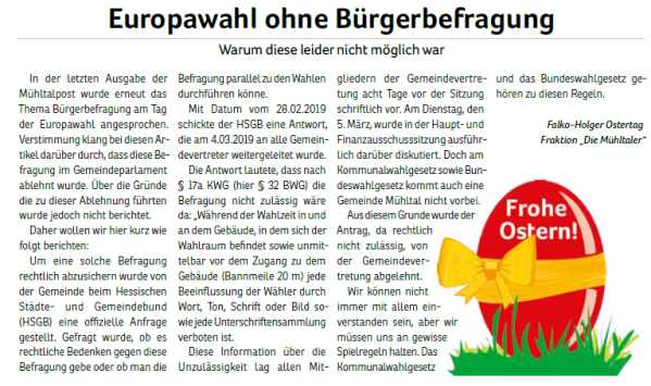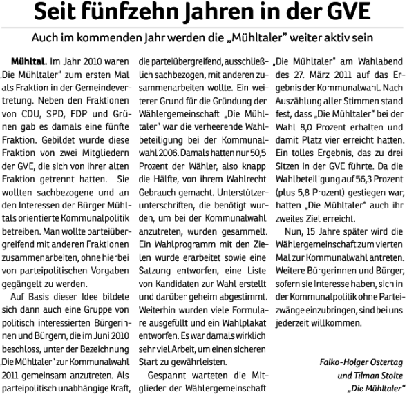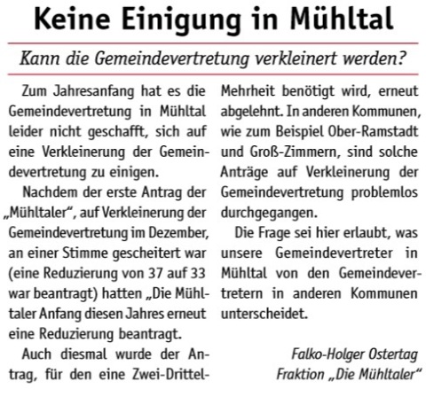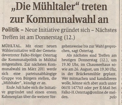 Wählergemeinschaften wie unsere entstehen in vielen Kommunen als Ergänzung zu etablierten Parteien. Seit 2011 sind „Die Mühltaler“ als Fraktion in der Gemeindevertretung vertreten und freuen sich über Menschen, die sich ebenfalls einbringen möchten.