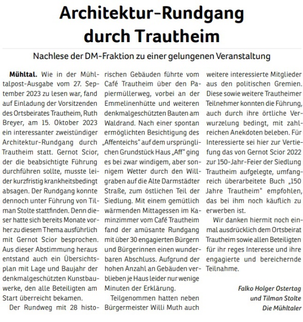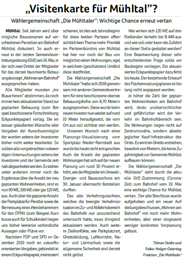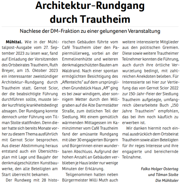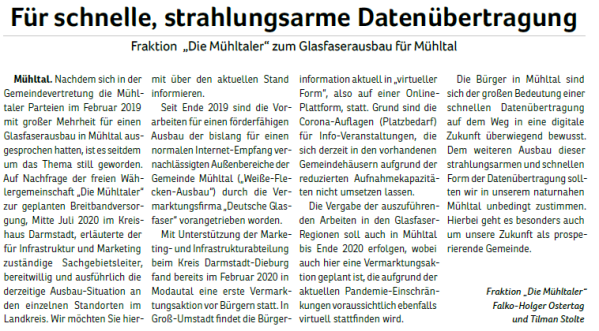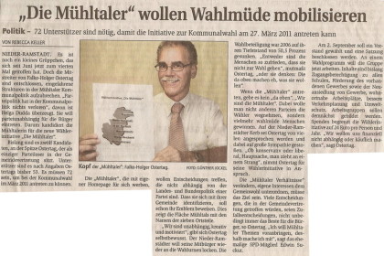 „Die Mühltaler“ gibt es seit Juni 2010. Aus einer ersten Idee wurde eine Wählergemeinschaft, die sich mehr Miteinander, transparente Entscheidungen und einen verantwortungsvollen Umgang mit Steuergeldern in Mühltal wünscht. 2011 traten wir erstmals zur Kommunalwahl an.