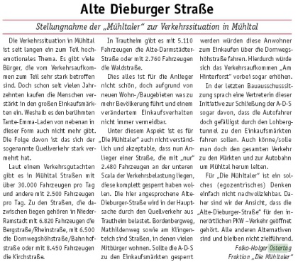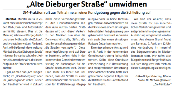 - Öffnung der Alten Dieburger Straße für den innerörtlichen PKW-Verkehr unabhängig vom Ausbau der Alten Darmstädter Straße.