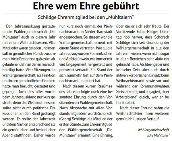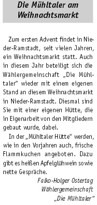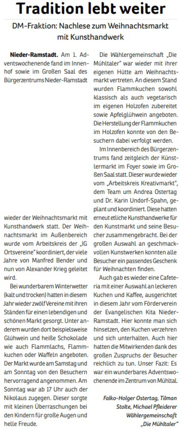 Ein entsprechender Antrag der Fraktion „Die Mühltaler“ wurde allerdings in der Gemeindevertretung mit 15 zu 19 Stimmen abgelehnt. In den Augen von CDU, Grüne und „Linke“ scheinen zusätzliche Lagerflächen und Büros für die Verwaltung wichtiger. Wichtiger denn das Interesse der Mühltaler Bürgerinnen und Bürger, die sich im Zentrum von Nieder-Ramstadt einen Ort der Gastlichkeit und der Begegnung wünschen.