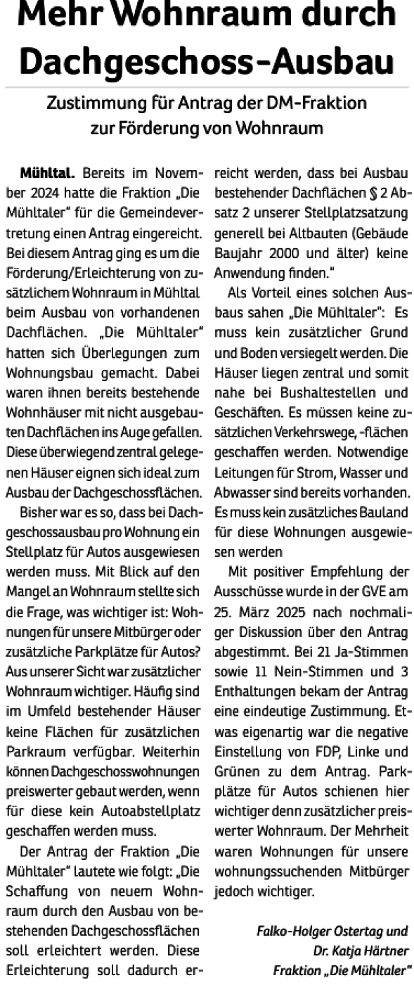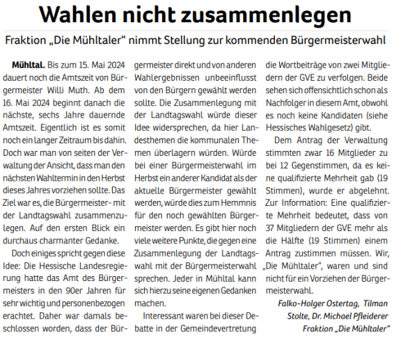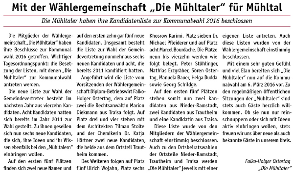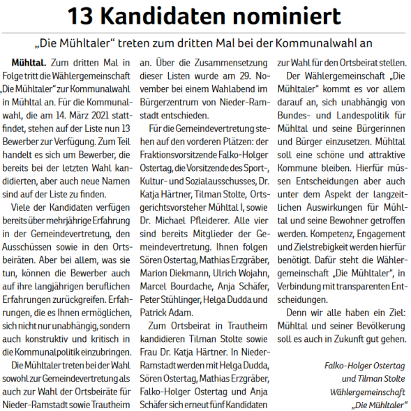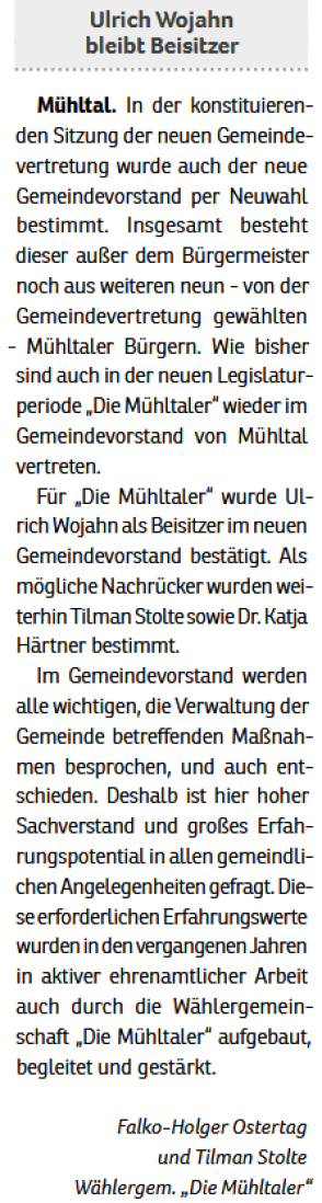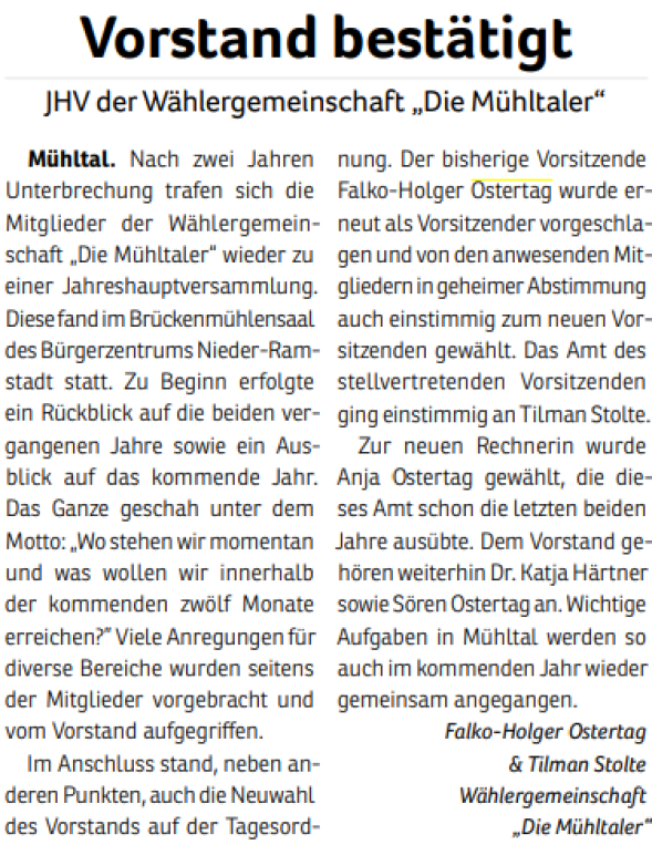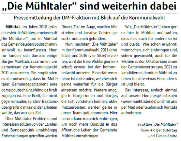 Wie auch schon 2011, 2016 und 2021 tritt die Wählergemeinschaft "Die Mühltaler" auch 2026 wieder zur Kommunalwahl an. Wir wollen somit an die vergangenen erfolgreichen Jahre anknüpfen und bundes- sowie landesparteiunabhängig Politik im besten Interesse unserer schönen Kommune im Grünen machen.