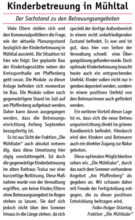 - Kontinuierliche Weiterentwicklung aller Betreuungsformen (U3, Ü3, Tagesmütter und Betreuung am Nachmittag) in Mühltal.