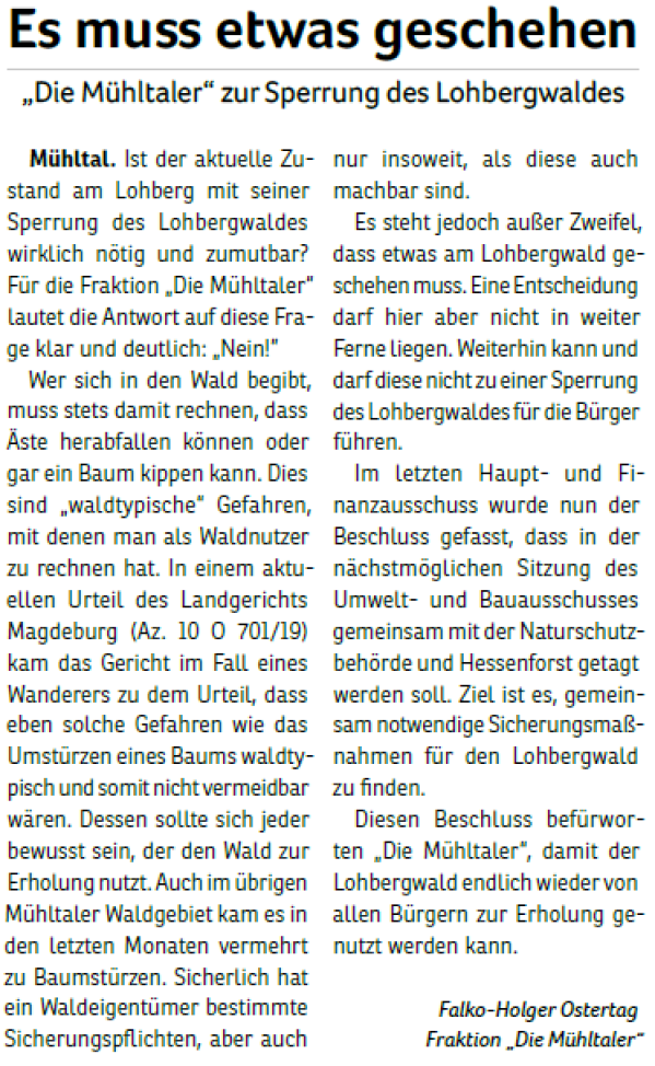 Er ist Gründungsmitglied und Fraktionsvorsitzender der Wählergemeinschaft „Die Mühltaler“ und seit rund 30 Jahren kommunalpolitisch aktiv. Falko-Holger Ostertag ist verheiratet, Vater von zwei Kindern und Großvater von fünf Enkelkindern. Seine Schwerpunkte sind die Bereiche Umwelt, Wohnungsbau und Finanzen.