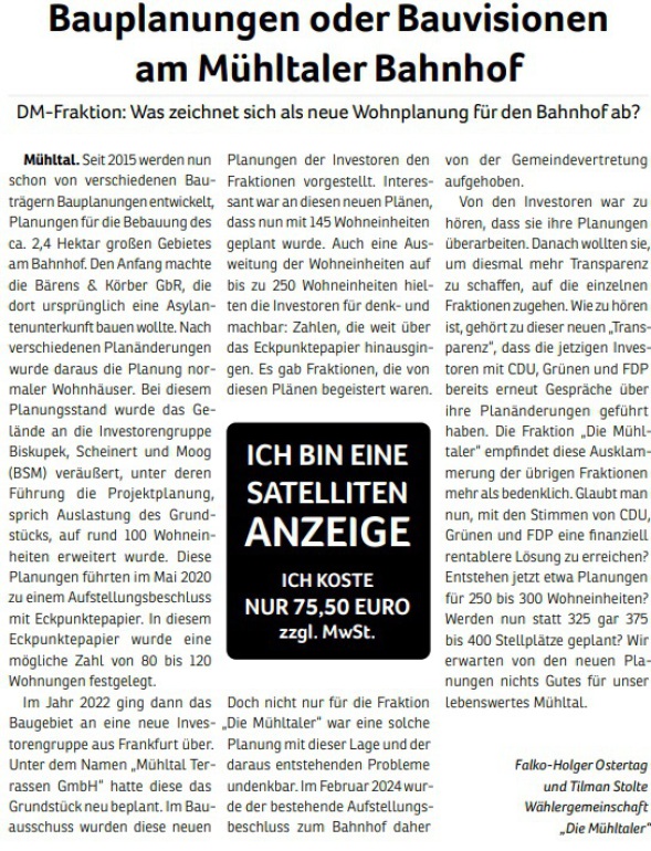 Weniger Plakate wären aus Sicht der Mühltaler deutlich besser gewesen. Leider sieht sich die Wählergemeinschaft „Die Mühltaler“ nun dazu gezwungen nun auch mehr als 35 Plakate zu hängen, um optisch nicht ganz weggedrückt werden.