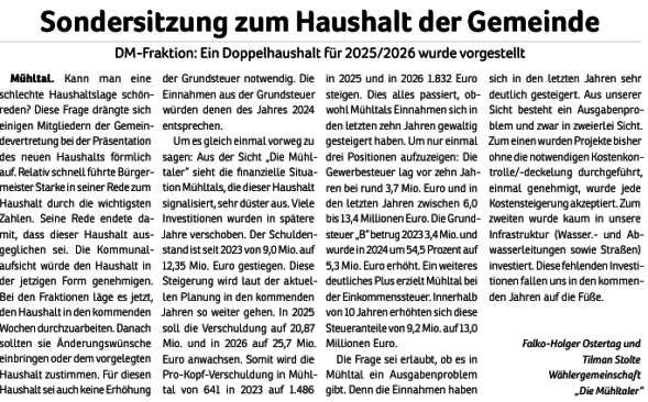Begründet wurde der Vorstoß mit der angespannten Haushaltslage der Gemeinde. Der aktuelle Doppelhaushalt 2025/2026 konnte nur durch einen Erlass des Innenministeriums genehmigt werden. Gleichzeitig steht die langfristige Zahlungsfähigkeit der Gemeinde unter Beobachtung der Kommunalaufsicht. Laut Planung sollen sich die Schulden innerhalb von zwei Jahren von 12 auf 24 Millionen Euro verdoppeln.