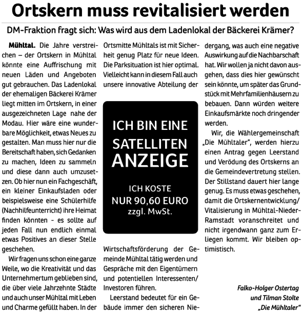 Die Mühltaler setzen sich in der Gemeindevertretung dafür ein, dass die Gaststätte erhalten bleibt, schon um eine weitere Verödung des Ortszentrums zu vermeiden.